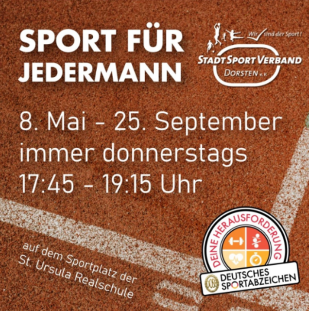 Seit dem 08. Mai wird vom Stadtsportverband wieder „Sport für Jedermann“ angeboten. Zur gewohnten Zeit, immer donnerstags von 17:45 – 19:15 Uhr, haben alle Bürgerinnen und Bürger wieder die Möglichkeit, sich unter Anleitung des ausgebildeten Übungsleiters Gregor Targowksi in munterer Atmosphäre einfach zum Spaß sportlich zu betätigen oder einige der leichtathletischen Disziplinen für die Ableistung des Deutschen Sportabzeichens zu trainieren. Neu ist jedoch der Ort. Denn wegen des Umbaus des...