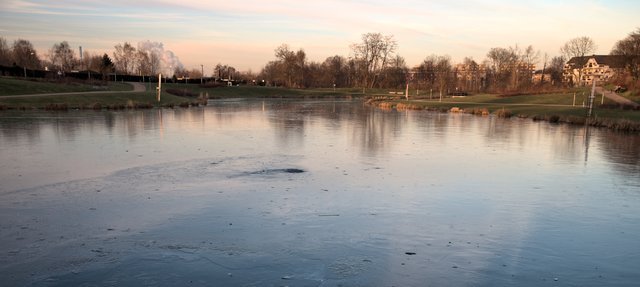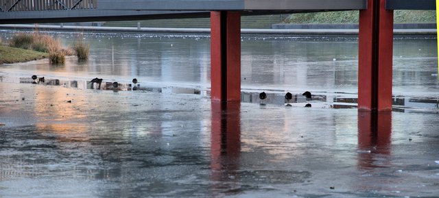 Es ist Winter und der Niederfeldsee ist zugefroren. Einige Wasservögel harren in der kleinen, offenen Wasserfläche noch aus.