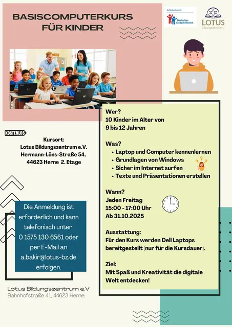 Wer? 10 Kinder im Alter von 9 bis 12 Jahren Was? Laptop und Computer kennenlernen Grundlagen von Windows Sicher im Internet surfen Texte und Präsentationen erstellen Wann? Jeden Freitag 15:00 - 17:00 Uhr Ab 31.10.2025 Ausstattung: Für den Kurs werden Dell Laptops bereitgestellt (nur für die Kursdauer). Ziel: Mit Spaß und Kreativität die digitale Welt entdecken!