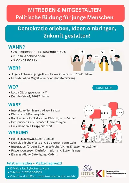 Demokratie erleben, Ideen einbringen, Zukunft gestalten! WANN?➡️ 28. September – 14. Dezember 2025➡️ Nur an Wochenenden➡️ 9:00 – 11:00 UhrWER?➡️ Jugendliche und junge Erwachsene im Alter von 15–27 Jahren➡️ Mit oder ohne Migrations- oder FluchterfahrungWO?➡️ Lotus Bildungszentrum e.V.➡️ Bahnhofstr. 41, 44623 HerneWAS?➡️ Interaktive Seminare und Workshops➡️ Planspiele & Rollenspiele➡️ Kreative Ausdrucksformen: Plakate, kurze Videos➡️ Exkursionen zu relevanten Einrichtungen➡️ Diskussionen &...