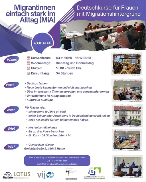 Das Lotus Bildungszentrum e.V. führt niedrigschwellige MiA-Kurse speziell für Frauen durch, um Migrantinnen im Alltag zu stärken. Die Kurse finden im Pavillon des Gymnasiums Wanne statt und behandeln praxisnahe Themen wie das Leben in Deutschland, Arztbesuche, Einkaufen, Wohnungssuche und weitere Alltagssituationen. Die in Kooperation mit dem Gymnasium Wanne organisierten Kurse stoßen bei den Müttern der Schule auf großes Interesse. Durch die Durchführung direkt auf dem Schulgelände im Pavillon...