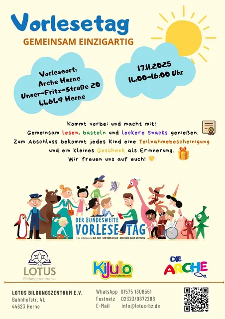 Kommt vorbei und macht mit! Gemeinsam lesen, basteln und leckere Snacks genießen. Zum Abschluss bekommt jedes Kind eine Teilnahmebescheinigung und ein kleines Geschenk als Erinnerung. Wir freuen uns auf euch! 💛 Vorleseort: Arche Herne Unser-Fritz-Straße 20 44649 Herne 17.11.2025 14:00-16:00 Uhr