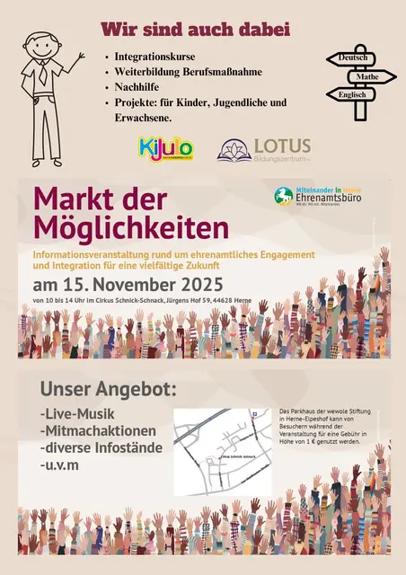 Möglichkeiten des Ehrenamtsbüros am 15. November im Circus Schnick-Schnack Entdecke die vielfältigen Möglichkeiten des Ehrenamts! Das Ehrenamtsbüro der Stadt Herne lädt alle Interessierten herzlich zum „Markt der Möglichkeiten“ ein. Hier können neue Projekte und Initiativen entdeckt und die unterschiedlichen Formen des ehrenamtlichen Engagements kennengelernt werden. Die Veranstaltung bietet ein breites Spektrum an Informationen darüber, wo, wie und wofür man sich engagieren kann. Der Markt der...