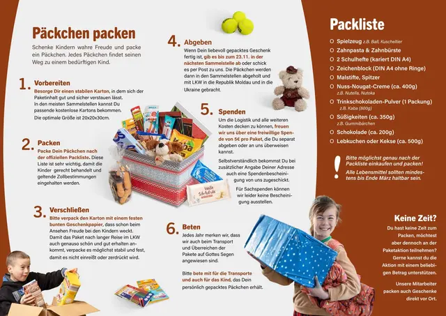 Daher hat sich die Freie evangelische Gemeinde ( FeG) Langenfeld erneut entschlossen, an der Aktion "Weihnachtspäckchen für Kinder in Moldawien & Ukraine" der "Hoffnungsträger Ost e.V." teilzunehmen. Nach mehrfachen Sammlungen für die Langenfelder "Tüte" möchten wir auch 2025 helfen, Kindern, die in diesen Krisengebieten leben, ein wenig Freude zu schenken. Und wir würden uns freuen, wenn wir besonders viele Päckchen auf den Weg bringen könnten. Eine Erklärung des Trägers dieser Aktion finden Sie unten angehängt. Die Kartons können über die FeG bezogen werden. Die Vorgabe des Inhalts dient allein der Vereinfachung der Zollabfertigung und der Gleichbehandlung. Haben Sie Interesse, sich zu beteiligen? Gerne nehmen wir Ihr Päckchen sonntags zwischen 9 und 12 Uhr entgegen. Letzter Abgabetermin ist der 23.11.2025. Danach werden die Päckchen von uns zur Sammelstelle Wermelskirchen zur weiteren Versendung gebracht.
