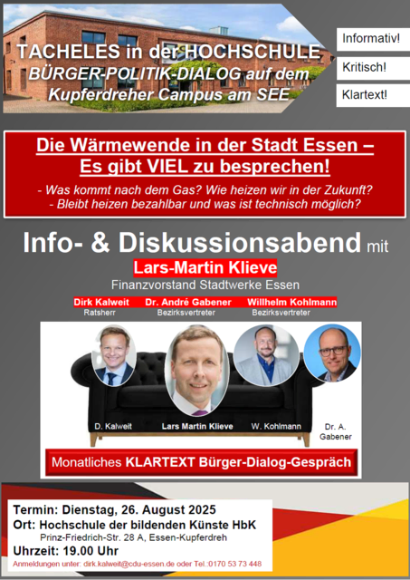 - Thema: `Öffentliche Sicherheit & Bevölkerungsschutz in Essen` - Gast: Christian Kromberg, Geschäftsbereichsvorstand der Stadt Essen für die Bereiche Recht, öffentliche Sicherheit und Ordnung Kupferdreh. Am Dienstag, den 25. November 2025, um 19.15 Uhr, ist es wieder soweit! Im Hörsaal der Hochschule der bildenden Künste (HBK), Prinz-Friedrich-Straße 28A in Essen-Kupferdreh, findet das zehnte und letzte monatliche KLARTEXT-Bürger-Dialog-Gespräch im Jahr 2025 statt, zudem alle interessierten...