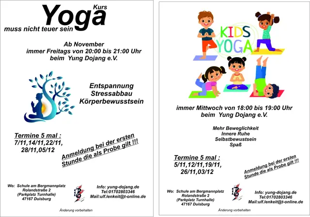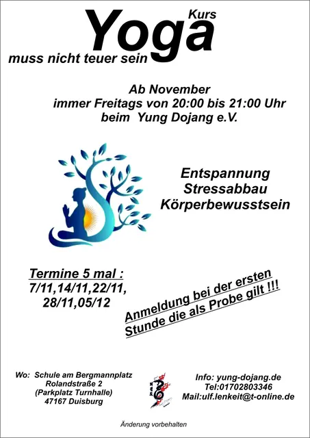 Es ist wieder soweit. Der Kampfkunstverein Yung Dojang e.V. in Duisburg Neumühl bietet wieder Yogakurse an. Weil immer wieder der Wunsch geäußert wir ein Yoga Kurs anzubieten der nicht an einer Mitgliedschaft gebunden ist füht der Verein immer wieder diese Kurse durch. Was nicht heißen soll das es in Zukunft doch die Möglichkeit geben wird Yoga in Form einer Mitgliedschaft anzubieten. Darüber wird aktuell nachgedacht. Wir möchten darauf hinweisen das unsere Kurse er für Anfänger gedacht sind...