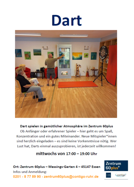 Jeden Mittwoch von 17 bis 19 Uhr treffen sich im Zentrum60Plus in Essen-Frohnhausen, Messings Garten 4, die Mitglieder des Dart-Clubs zum geselligen Wurf auf die Scheibe. Ob Anfänger oder erfahrener Spieler – hier geht es um Spaß, Konzentration und ein gutes Miteinander. Was macht Darts so besonders? Darts ist ein beliebtes Geschicklichkeits- und Präzisionsspiel, bei dem kleine Pfeile (Darts) auf eine runde Zielscheibe geworfen werden. Gezählt wird je nach Spielvariante – und neben der...