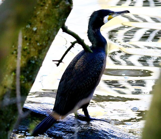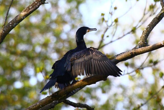 Friedlich saßen die Kormorane auf dieser kleinen Steininsel. Auf einmal landete ein Graureiher auf die Insel. Zunächst verhielt er sich ganz ruhig und beobachtet die Umgebung. Langsam tastet er sich Stück für Stück nach vorne und näherte sich dem Kormoran, der das aber gar nicht lustig fand. Der Graureiher geht mit ausgestreckten Flügeln und schreiend auf den Kormoran der in seiner Nähe stand los. Der Größenunterschied flößt Respekt ein, da hatte der Kormoran lieber das Weite gesucht.