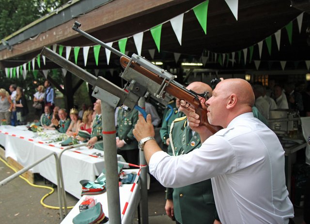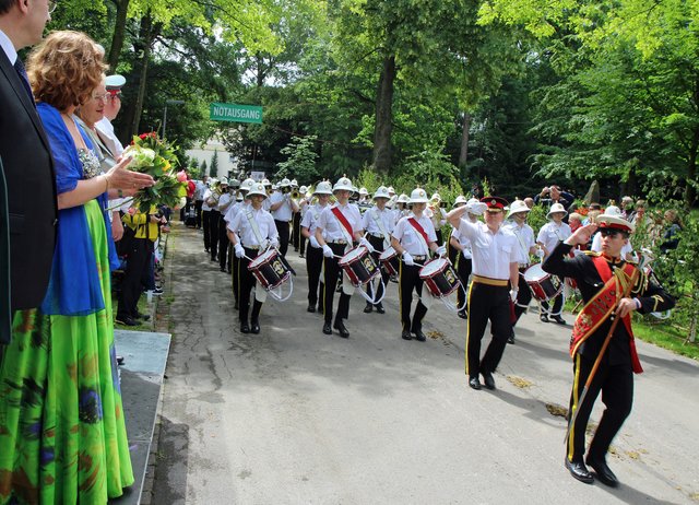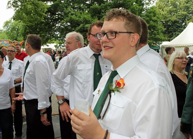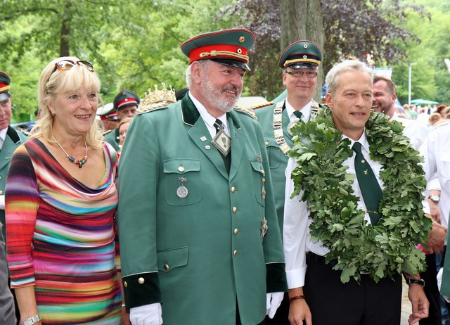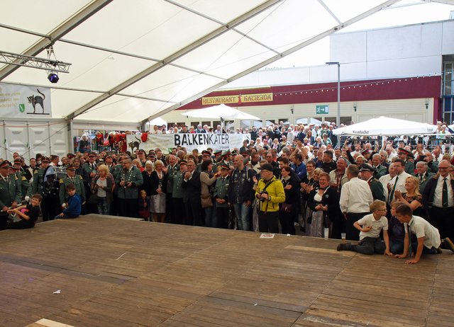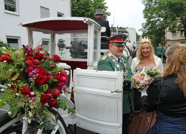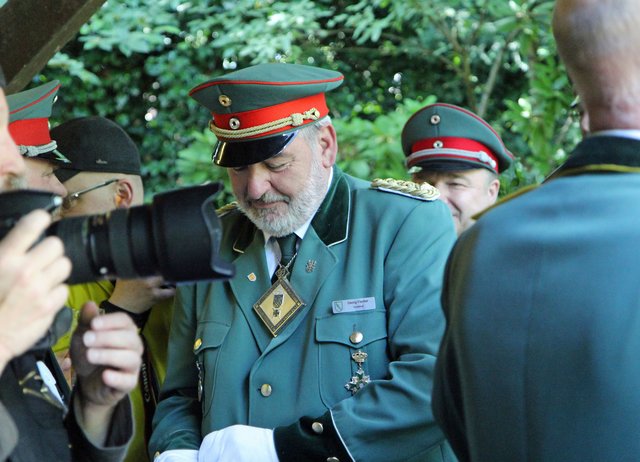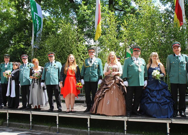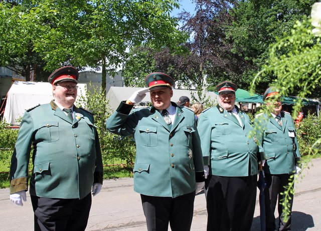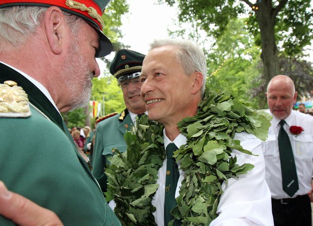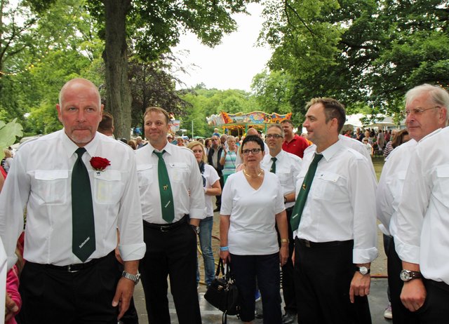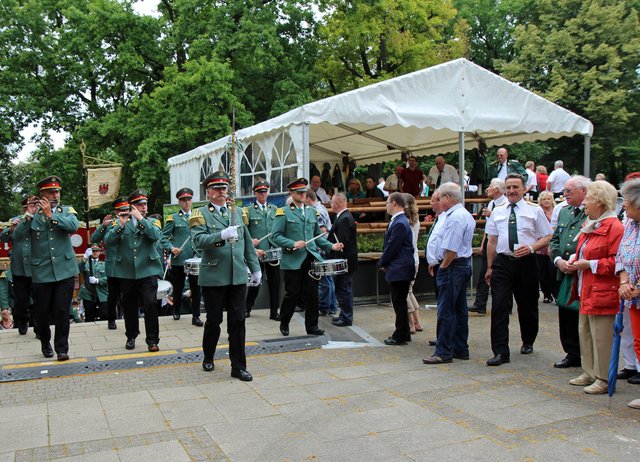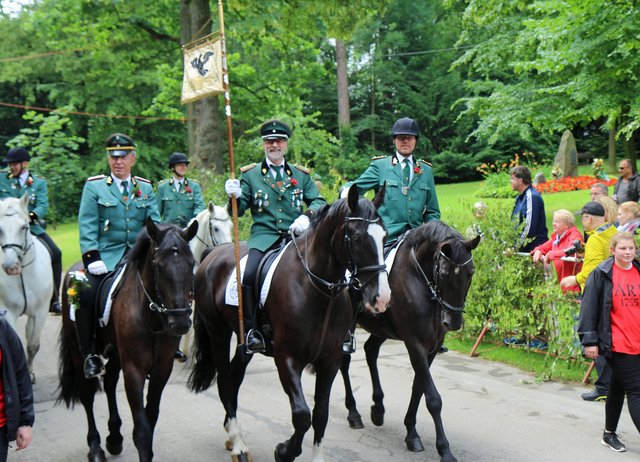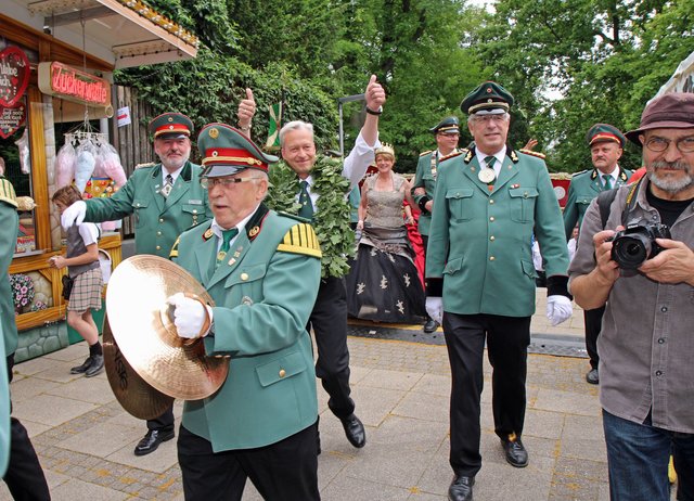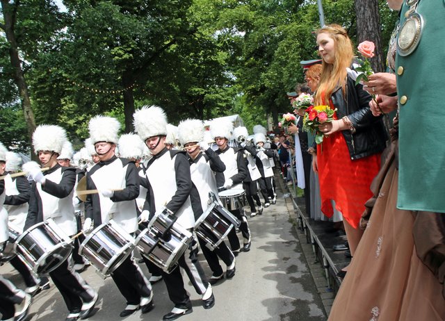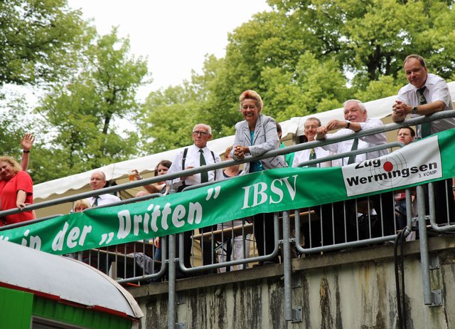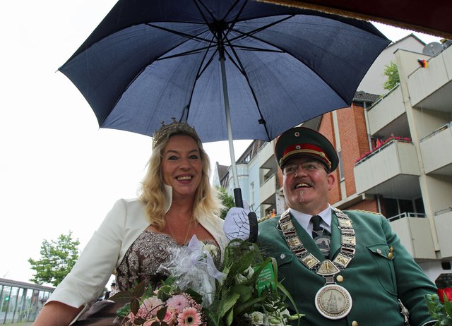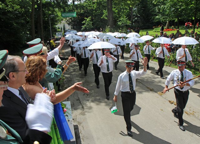 Mit sorgenvollem Blick ging der Blick der Schützen am Antreteplatz gegen den grauen Himmel, ob die Wolken erneut ihre Schleusen öffnen sollten. Doch es sollte nicht so kommen. Denn bis auf ein paar Regentropfen am Stadtbahnhof hielt das Wetter. Und wenig später auf der Paradestraße, kam sogar die Sonne raus, was einige Kameraden dazu veranlasste, dies dem scheidenden Königspaar Ralf Wille und Kirsten Greitzke zuzuschreiben, welches ja bekanntermaßen als Regen-Regenten in die IBSV-Geschichte...