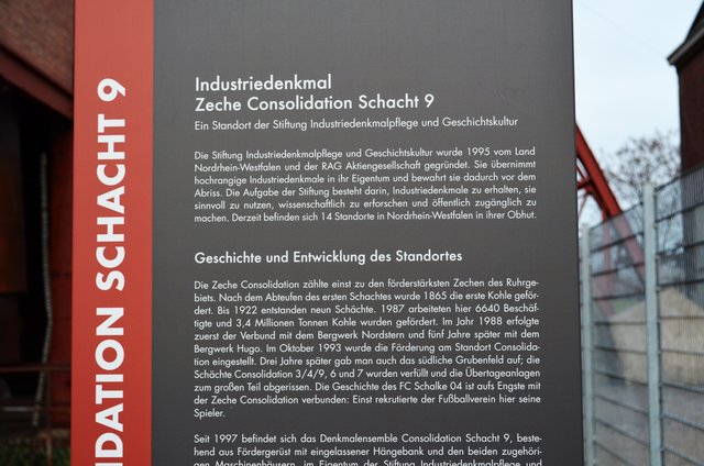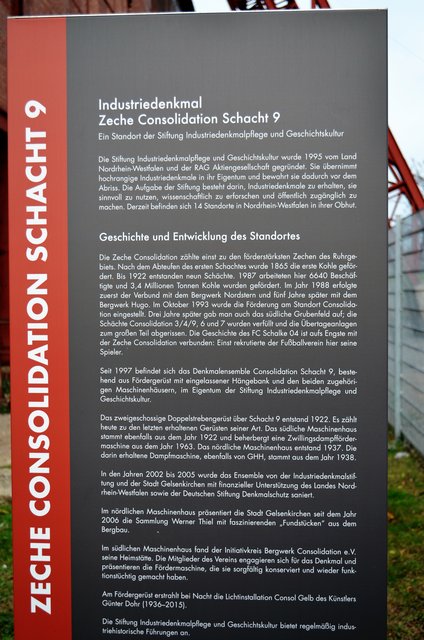 Die Zeche Consolidation oder verkürzt „Consol“ war ein Steinkohlen-Bergwerk in Gelsenkirchen. Heute stehen die Anlagen unter Denkmalschutz bzw. werden gewerblich oder kulturell genutzt … Die Gelände Schacht 1/6 und 2/7 sind komplett in Gewerbenutzung übergegangen. Die Förderanlagen über Schacht 4 und 9 sind auf dem Gelände 3/4/9 erhalten geblieben. Das Lüftergebäude und das Maschinenhaus Schacht 4 sowie der Förderturm werden kulturell genutzt (Consol-Theater, Musikprobenzentrum C4). Für die...